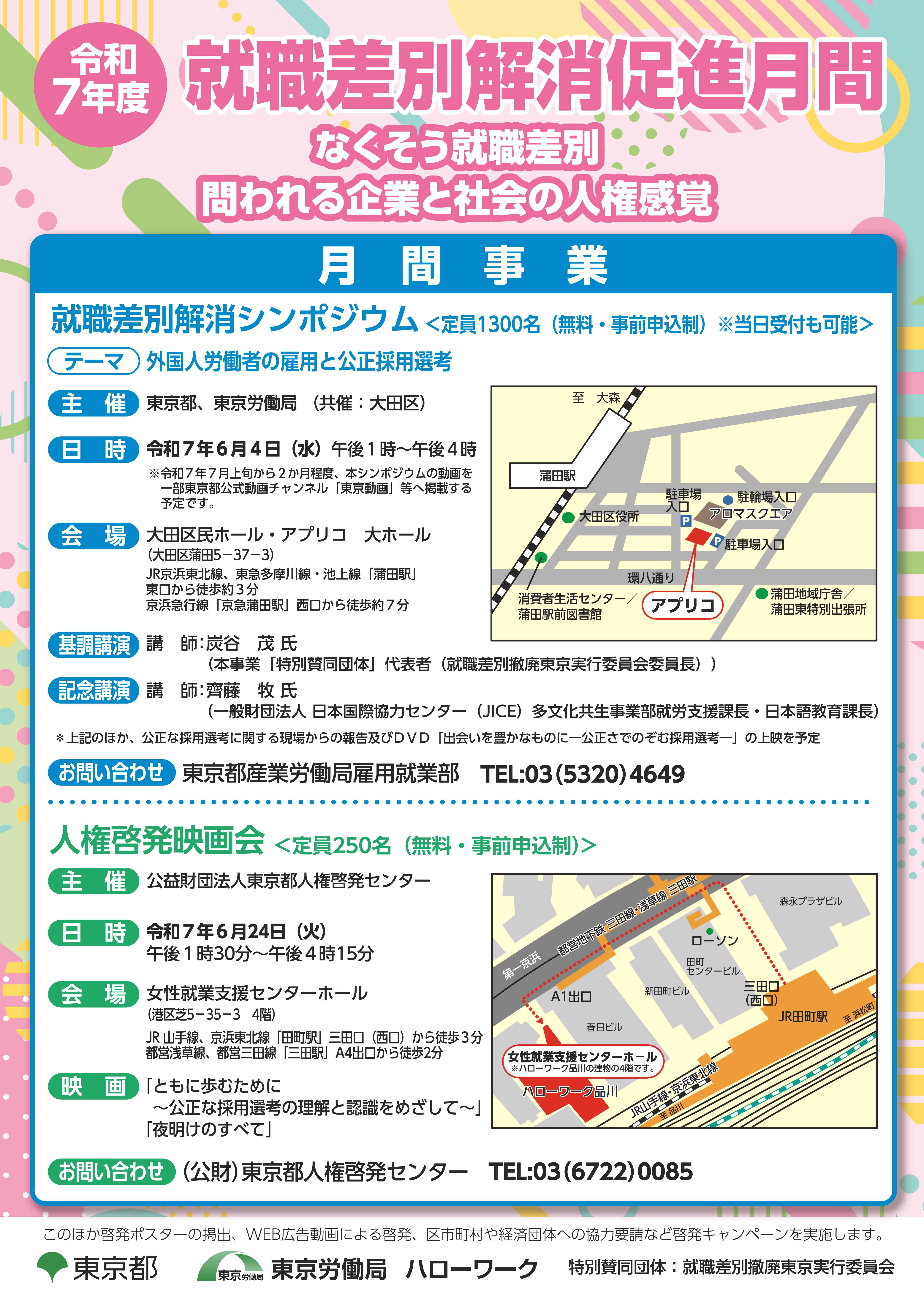 東京都では、6月を「就職差別解消促進月間」とし、就職差別をなくし、就職の機会均等を確保するため、東京労働局及びハローワーク等と連携して啓発活動を展開しています。