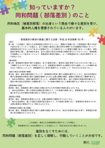 東京都は、「部落差別解消推進法」等に基づき、同和問題(部落差別)への理解と差別意識の解消に向けた教育・啓発のほか、就職差別をなくすための企業などへの啓発や、差別につながる調査をしない、させないための啓発など、様々な取組を進めています。